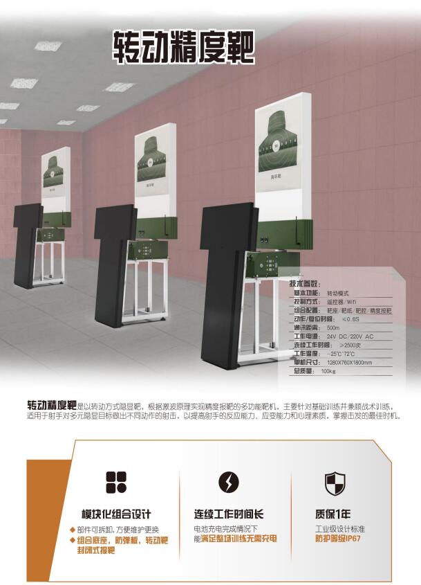 昆山九毫米電子科技有限公司:18691818382,是一家專業(yè)從事部隊(duì),武警,公安射擊訓(xùn)練器材的研發(fā)、 設(shè)計(jì)、生產(chǎn)型企業(yè)。公司產(chǎn)品以智慧化靶場,激波報(bào)靶設(shè)備為核心,主營產(chǎn)品包括起倒激波靶、升降激波靶、固定激波靶、起倒靶、升降靶、轉(zhuǎn)動靶、移動靶、起倒轉(zhuǎn)動靶、地堡靶、裝甲移動靶、裝甲起倒靶、運(yùn)動靶等各類靶機(jī)設(shè)備。